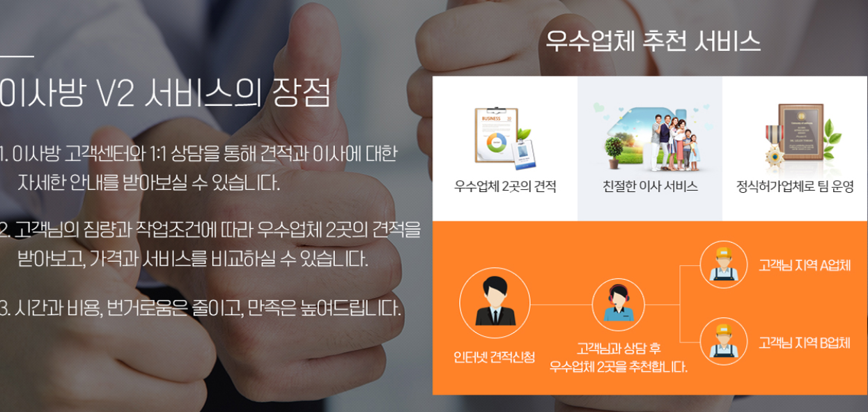 본인이 이사 서비스가 어느곳이 좋고 괜찮은 곳인지 잘모르시는 분도, 시간이 없어서 일일이 알아보지 못해도 이사방에서 알아서 선별하여 두곳을 연결해주니까 무료방문경적 서비스를 받고 원하는 업체를 선택해서 이사만 하면 되게 도와줍니다.