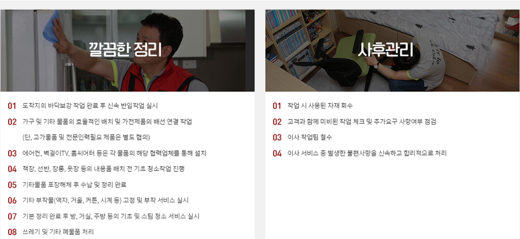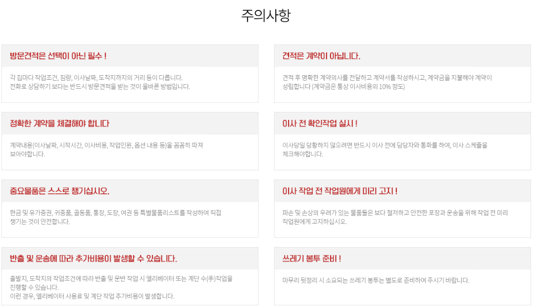 주의 사항은 꼼꼼하게 살펴보시고 어느 이사업체를 사용하시던 귀중품과 중요한 물품은 스스로 챙기는게 안전합니다. 고가의 중요한 파손위험이 있는 물품의 경우 이사 작업전에 미리 작업하시는 분들에게 알려주시면 더 안전하게 포장해주십니다. 마무리 뒷정리에 쓰레기봉투는 별도로 준비해두는 것이 좋습니다.