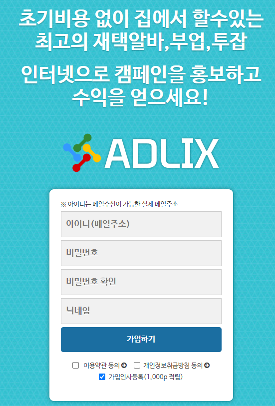 안녕하세요 오늘은 간단하게 집에서 하루에 약 15분 ~ 30분의 시간만 투자하면 한달에 부업으로 꽤 괜찮은 수익을 낼 수 있는 '애드릭스'에 대해서 소개해드리겠습니다. 현재 신규가입 이벤트로 모든분께 10,000P 적립중이니 이벤트가 끝나기전에 이용해보세요! 오늘 당장 가입하자마자 11,000원 벌어가실 수 있습니다.